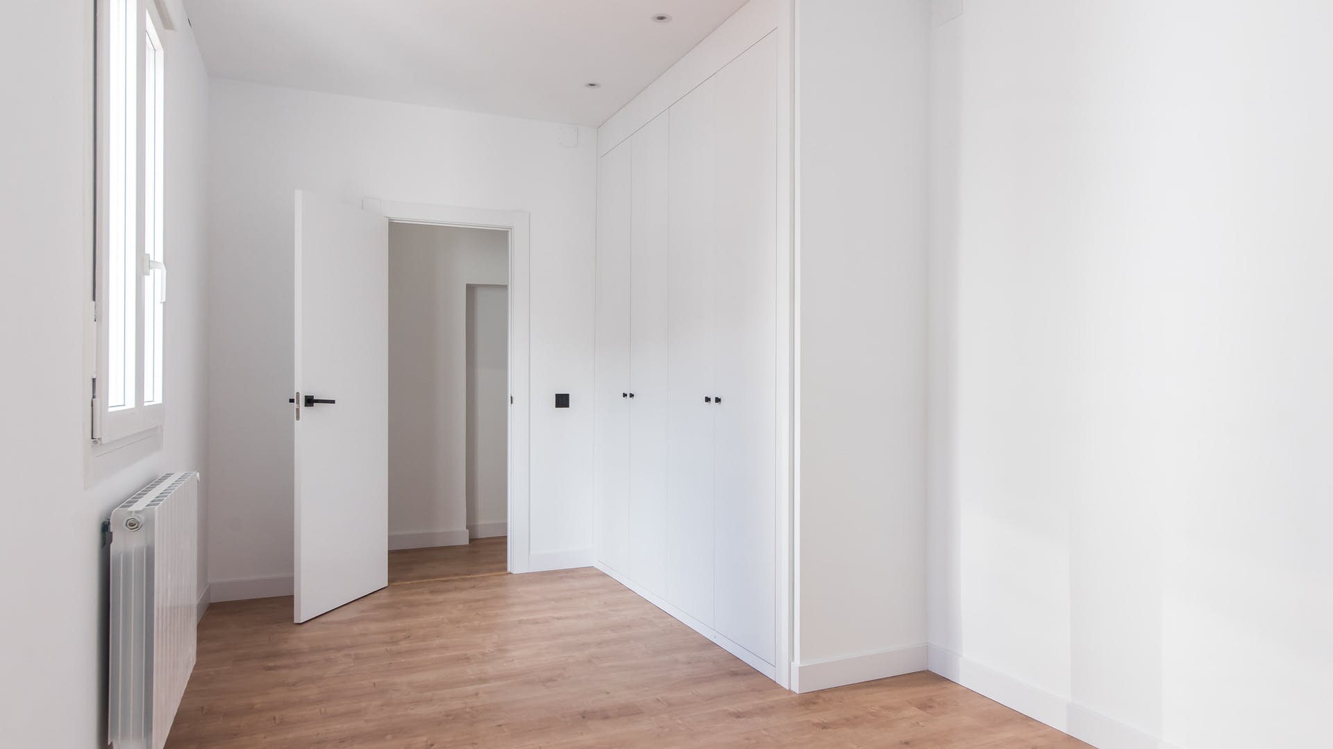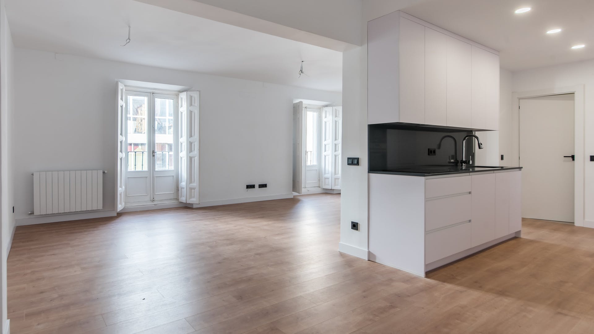Reforma interior con paredes en blanco y obra pendiente.Salón moderno con cocina americana y ventanas blancas.